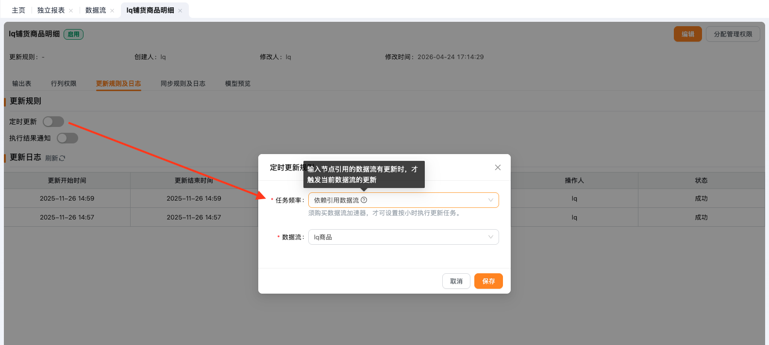 数据流-定时更新:支持配置,引用的数据流有更新时,自动触发当前数据流的 ETL 任务,确保数据依赖的正确性。