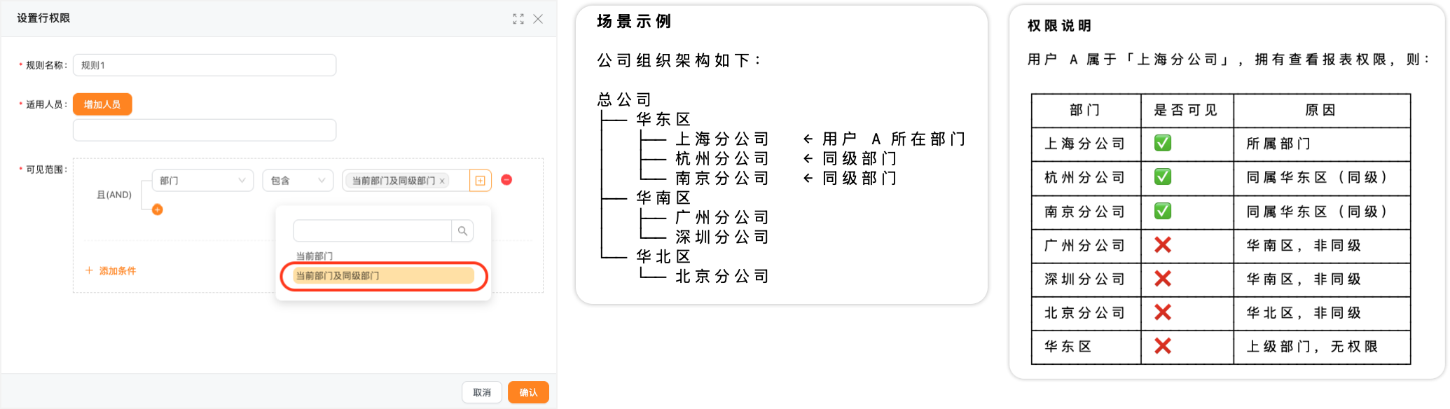 用户查看区域销售报表、同级绩效对比等场景报表时,需要横向对比同级数据,但不允许越权查看其他区域的数据。