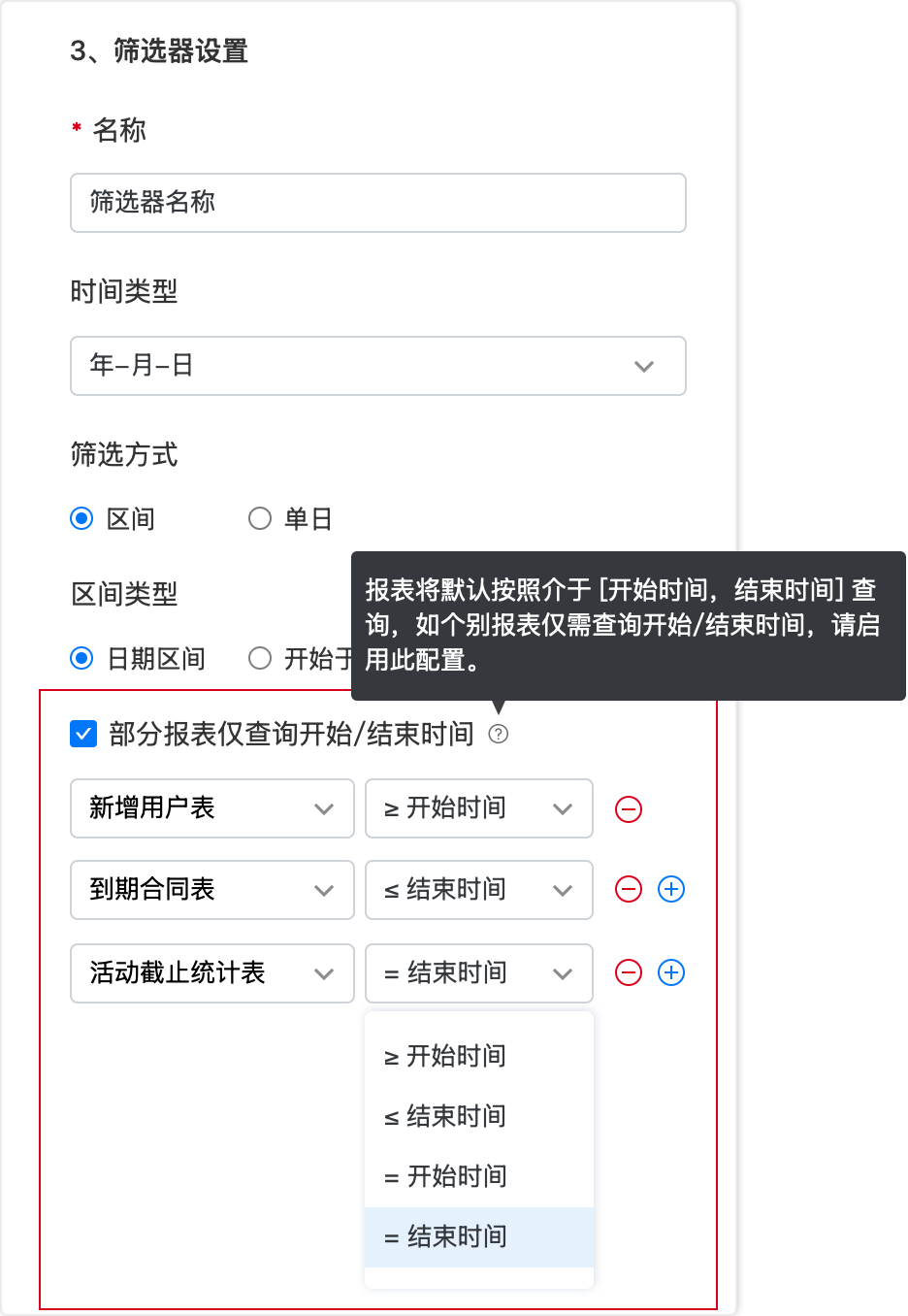 - 日期-区间筛选器:【启用】部分报表仅查询开始/结束时间,并按需配置条件;