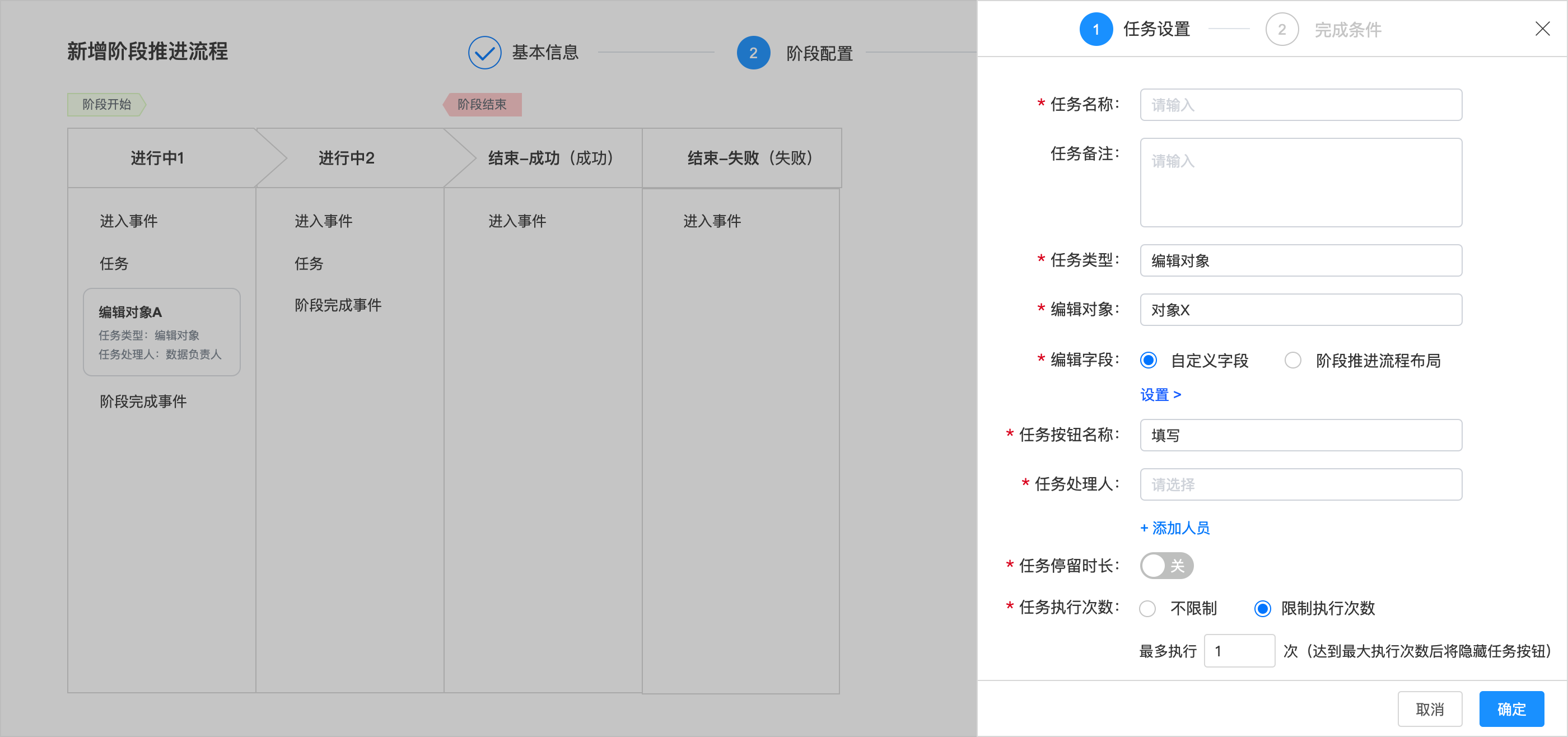 阶段推进流程设置阶段任务时,支持配置“任务执行次数”: