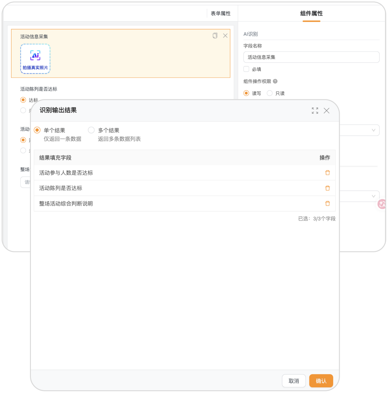 - 输出模式灵活可选 :AI 识别组件现已支持“单结果”与“多结果”两种输出配置,适配从简单判定到复杂采集的各类作业。