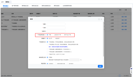 【费用池-费用池账户】中新增费用池账户时增加“下单适用范围”属性。可控制直营订单、分销订单在下单时,根据勤策端、订货端下单平台控制是否可使用该费用池账户