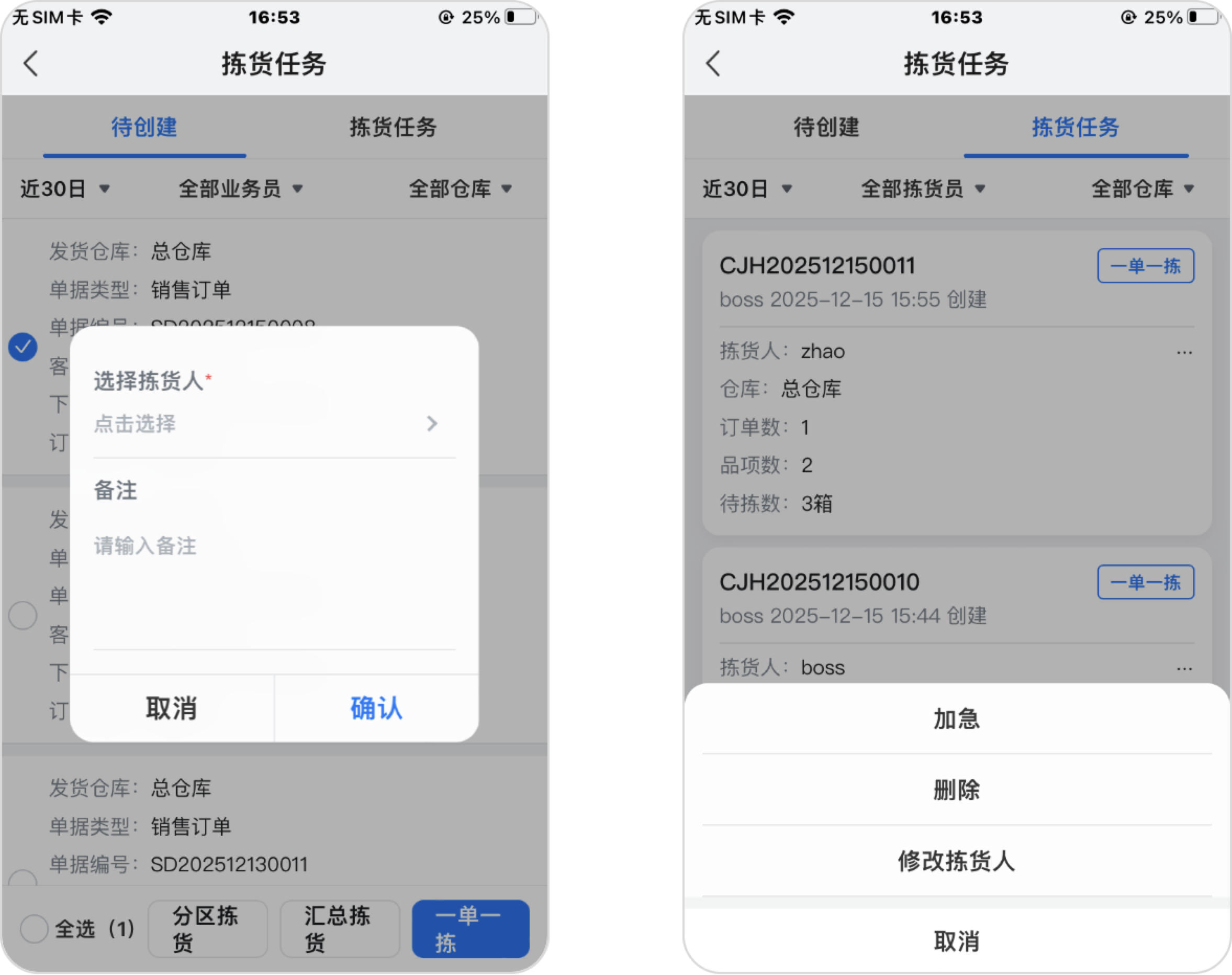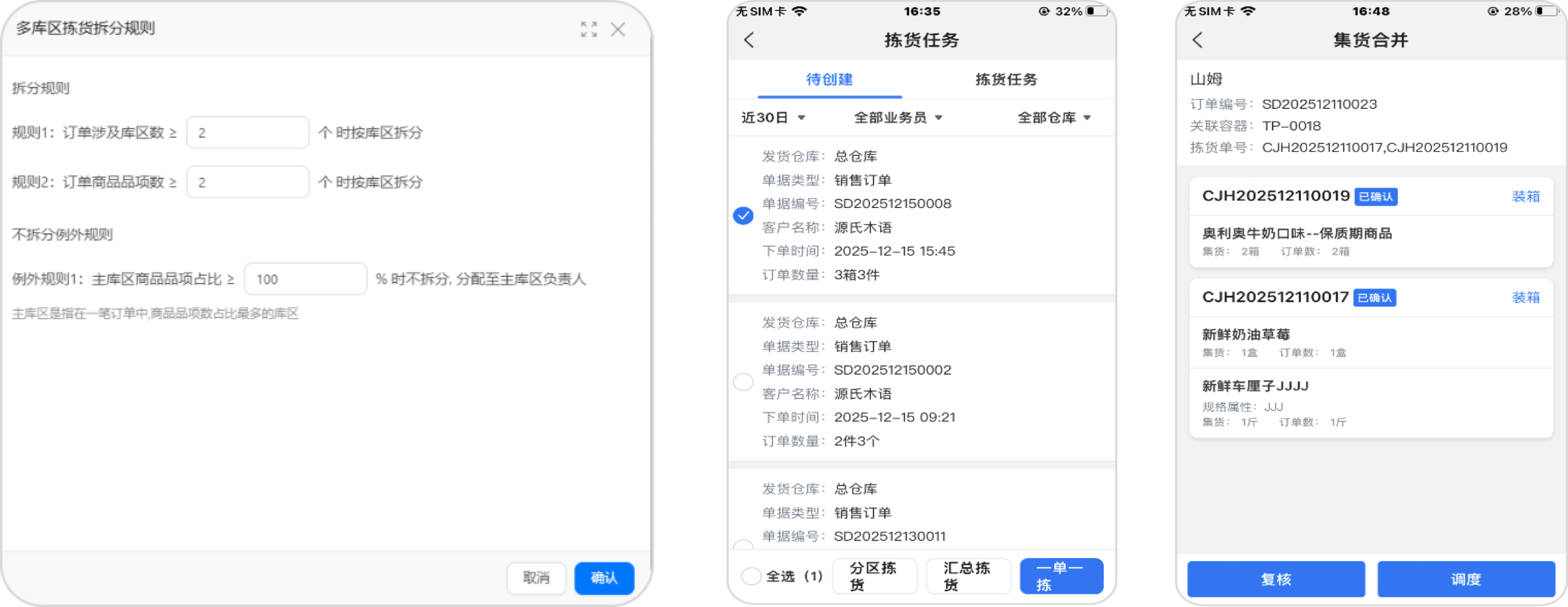 2、支持分区、汇总、一单一拣的分配模式,选择拣货人后,按照对应的拣货模式进行分配