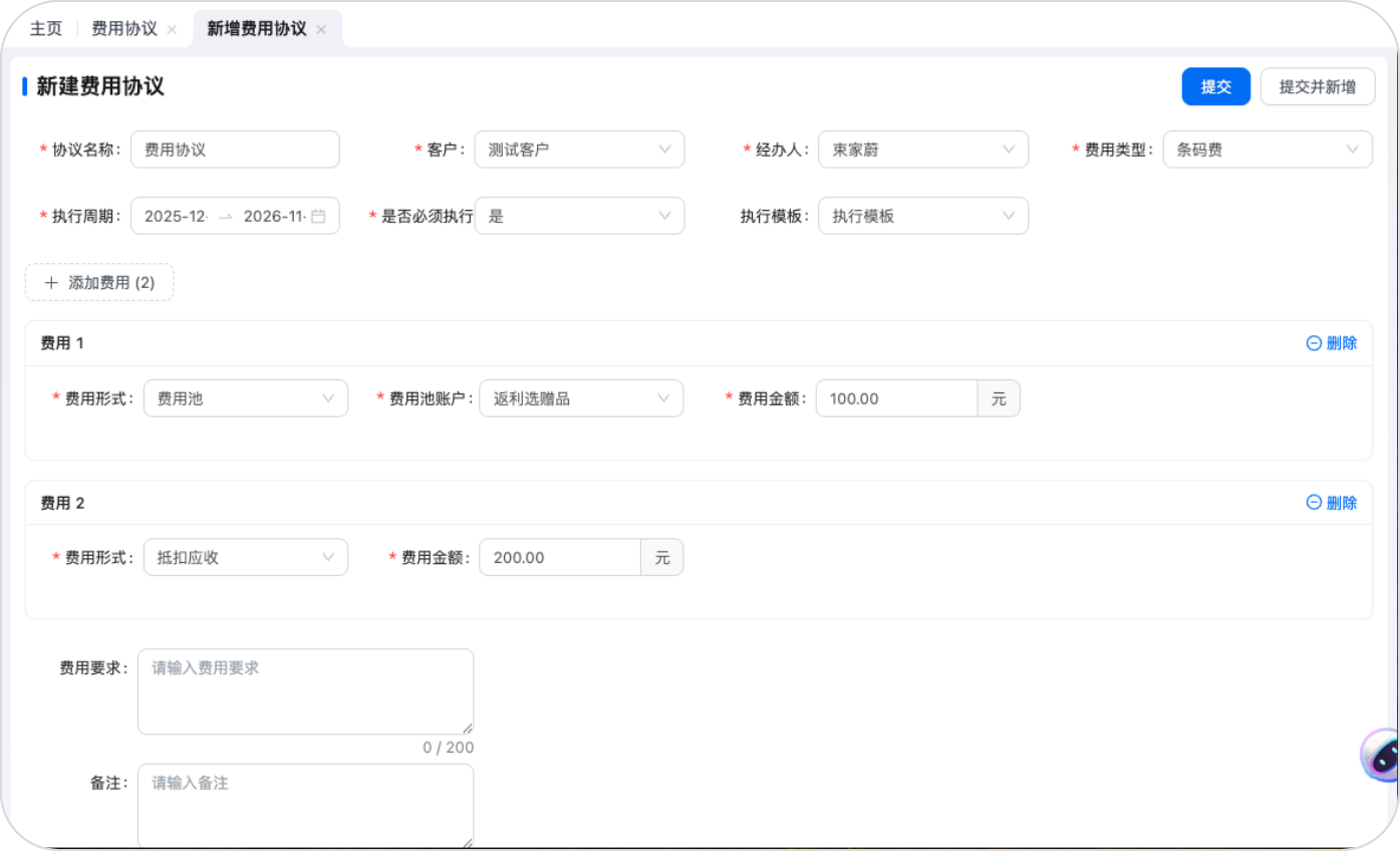 1、新增费用协议,支持一次性投放多种费用形式,目前支持费用池、抵扣应收、优惠券三种形式;