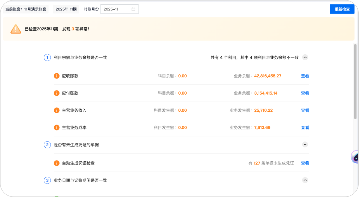 对账检查业务数据和财务数据余额一致,但发生额存在差异,原因是财务将红冲数据统计在发生数据中,业务未统计。