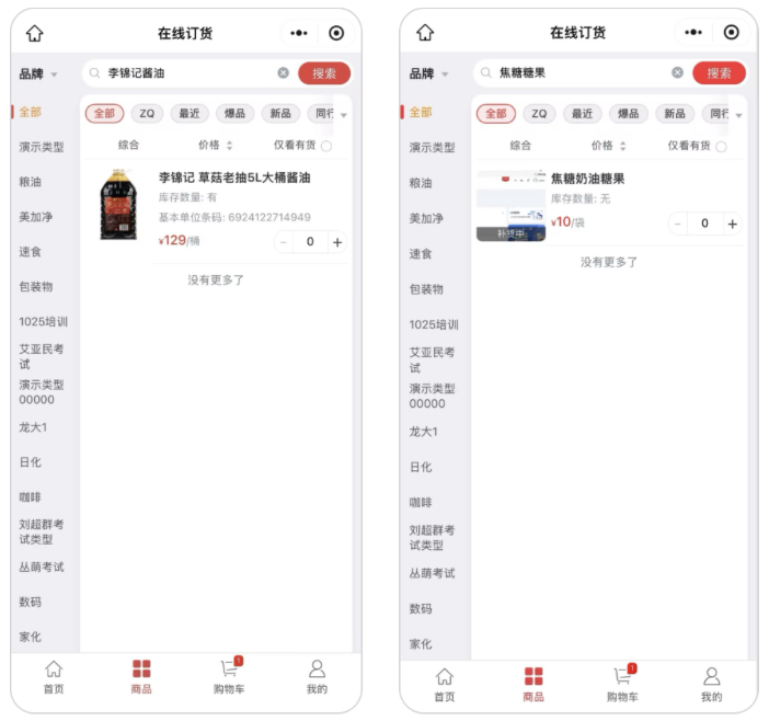 1、支持分词搜索,如李锦记草菇老抽5L大桶酱油,在输入搜索词时,将搜索词进行分词后再匹配商品名称,支持输入“李锦记酱油”“老抽李锦记”搜索到对应商品;
