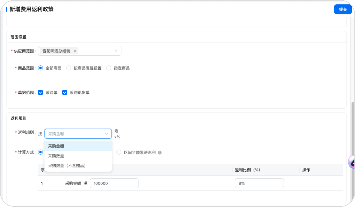 2.支持按采购金额、采购数量的达标情况,设置返点规则。