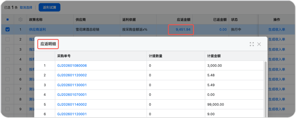 5.点击应返金额支持下钻查看符合返利政策的采购单/采购退货单明细记录及对应的计提数量/计提金额。