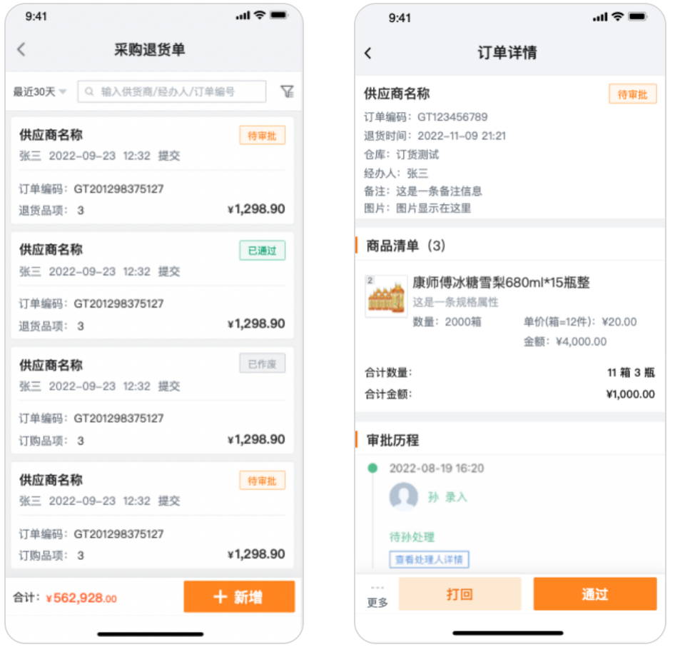 2.支持查看采购退货单的列表及详情页;