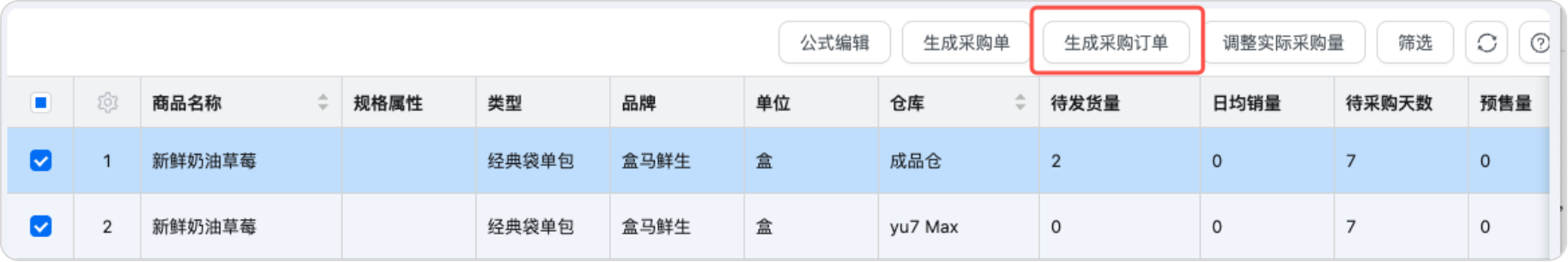 2.支持勾选商品后生成采购订单,等实际到货后再生成采购单,减少中间反复修改的步骤;