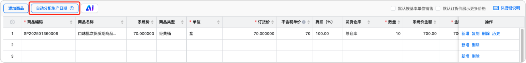 针对启用保质期管理的商品,开单时需依据所选商品、下单数量,结合各生产日期的库存数据,自动按先进先出原则分配对应批次及数量,降低商品效期损耗风险。