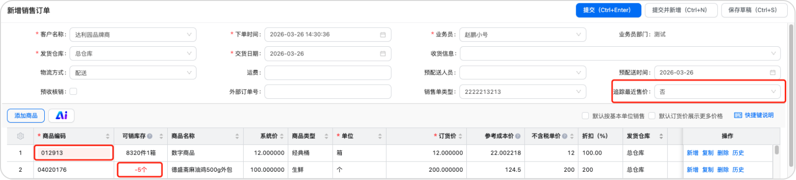 1、根据企业的「销售订单关联库存」判断可销库存不足时,可销库存字段是否高亮显示,如果企业是展示库存,不足时进行提示或不允许下单,在录入商品和数量后,可销库存数量高亮提示;