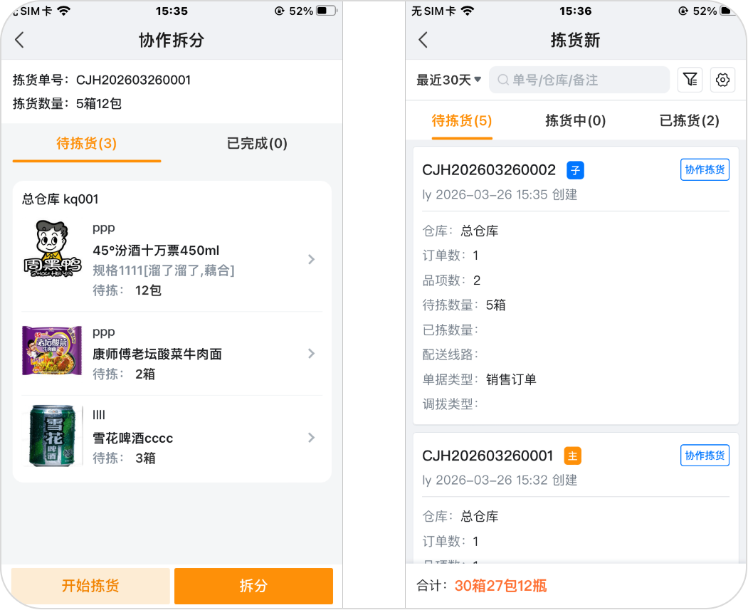 3、一单一拣支持拆分为协作拣货,其他类型的拣货不支持拆分;