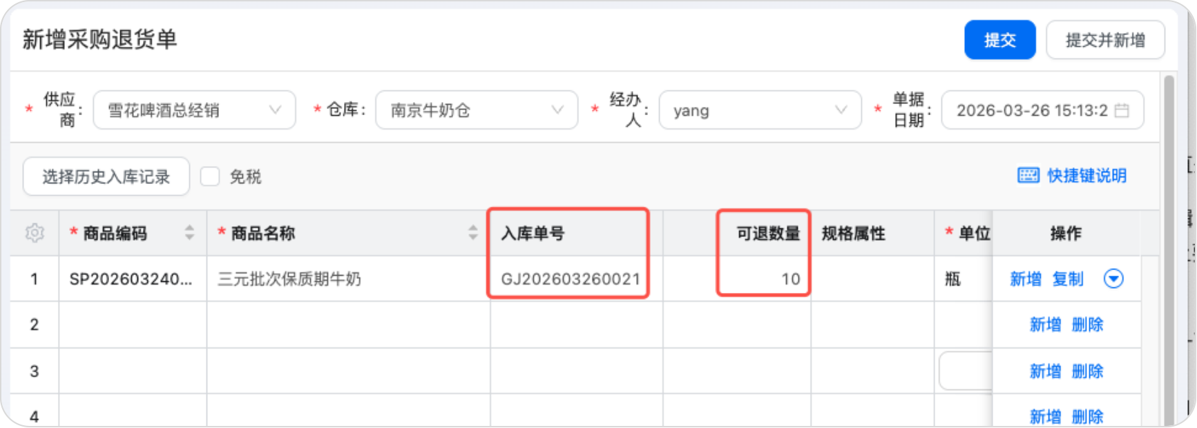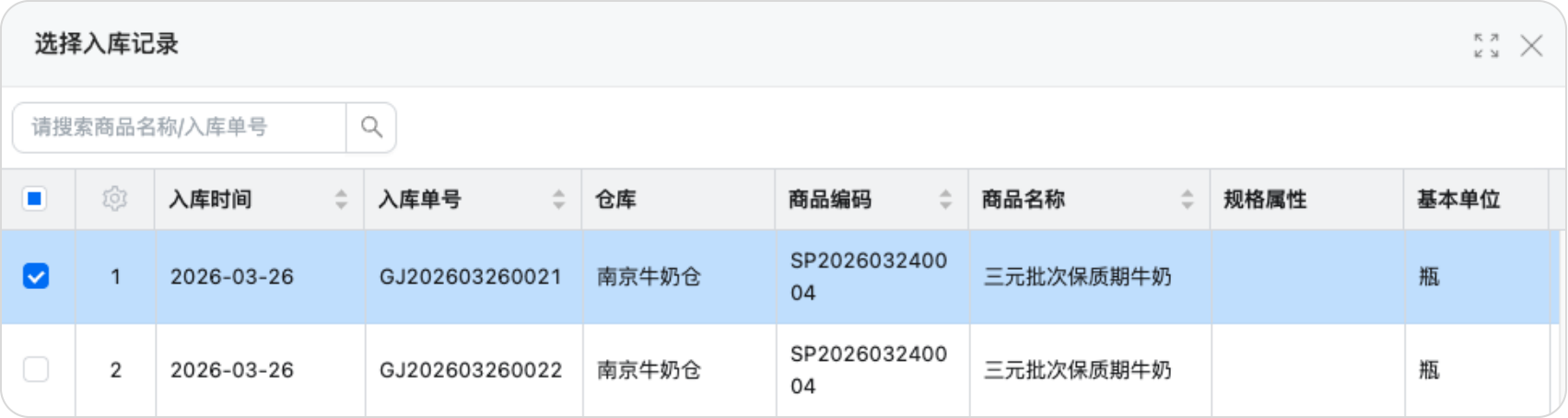 先进先出模式下,采购退货单调整为选择入库记录退货,退货时需找到对应要退货的入库记录进行操作。