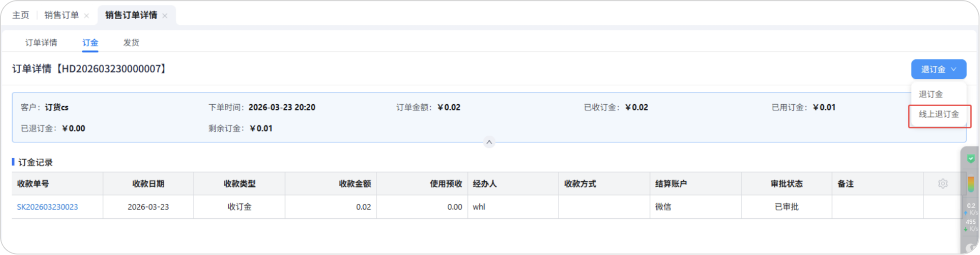 2、有允许退定金权限的操作账号,在订单详情页的订金页签,可以点击在线退订金按钮发起退定金;