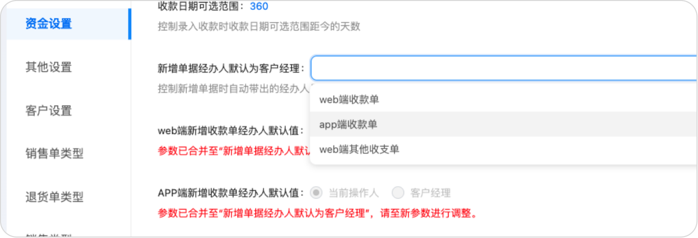 1、增加参数“新增单据经办人默认为客户经理”,原收款单的参数也合并至这个参数,选择相应的单据后,新增单据时经办人会带出客户经理;